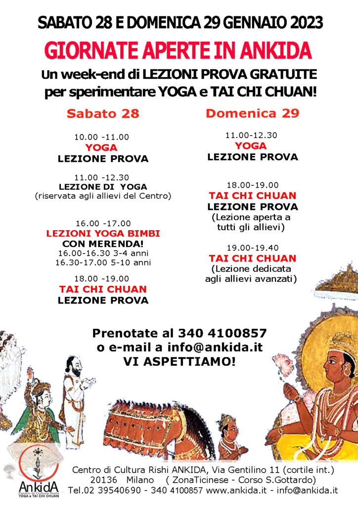 Per due giorni al Centro Ankida si susseguiranno lezioni di prova di Yoga e di Tai Chi Chuan e ci sarà anche Yoga per Bambini, un nuovo corso dedicato ai più piccoli.